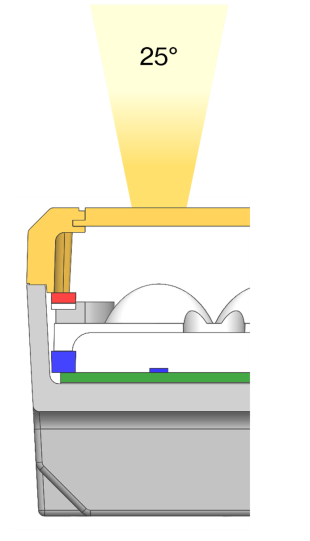 The light is delivered assembled in the default configuration with the lens plate positioned at Position 2 (25°) and the TR cap.