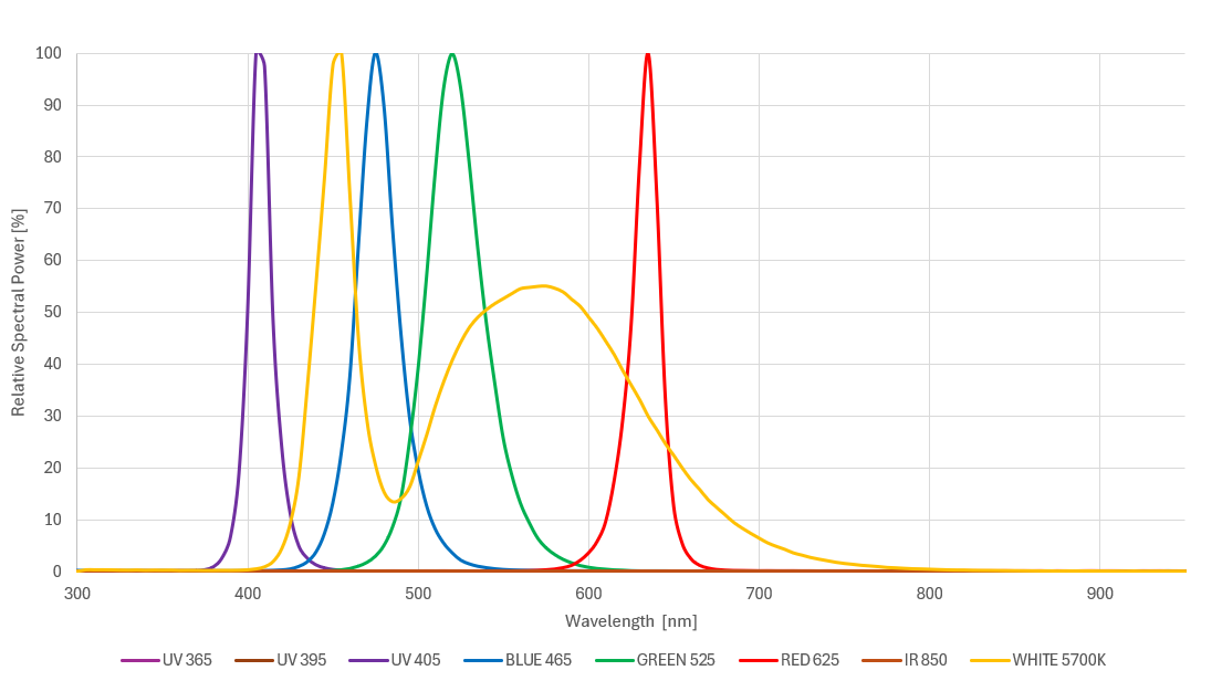Wavelength (nm) 365 (UV) 395 (UV) 405 (UV) 465 (Blue) 525 (Green) 625 (Red) 850 (Infrared) 000 (White)