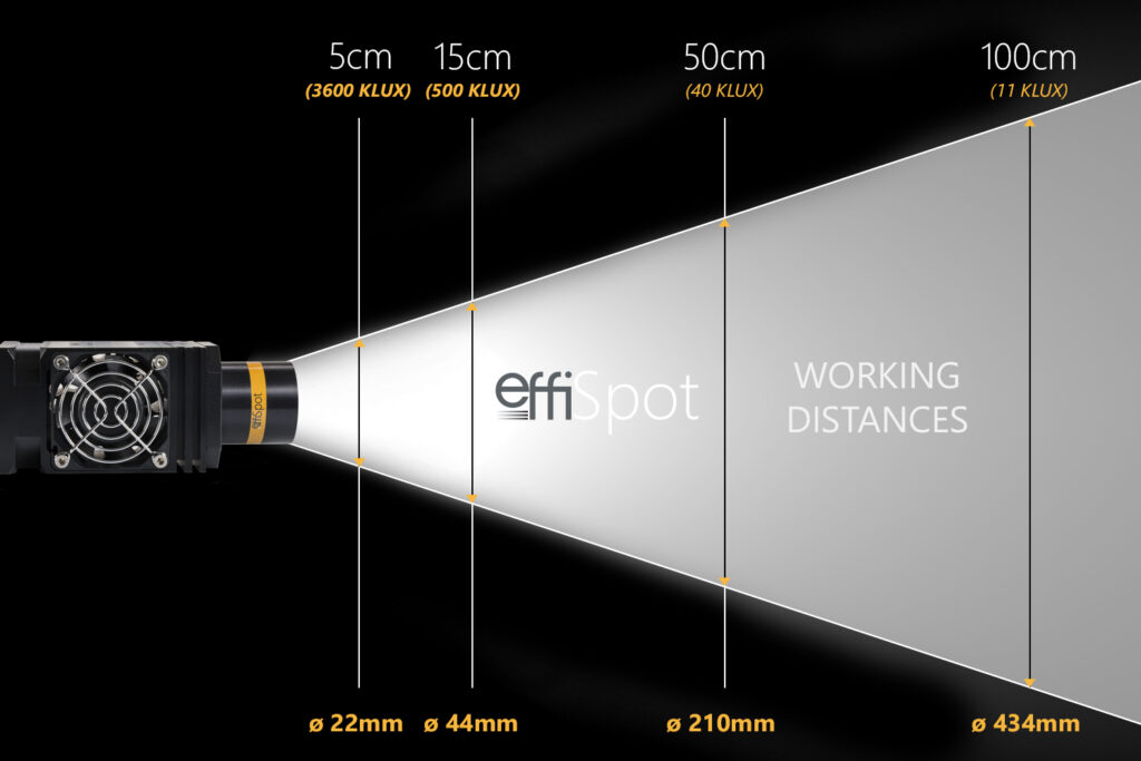 EFFI-SPOT LED Projector is a compact, high-power lighting solution designed for short-range applications up to 50 cm. Equipped with an integrated fan for optimal thermal management, it’s ideal for industrial and scientific setups using high-speed cameras—such as PIV, troubleshooting, and motion analysis. The EFFI-SPOT offers flicker-free dimming control, ensuring stable and adjustable illumination. Its standout features—compact design and intense brightness—make it a reliable choice for precision lighting in demanding environments.